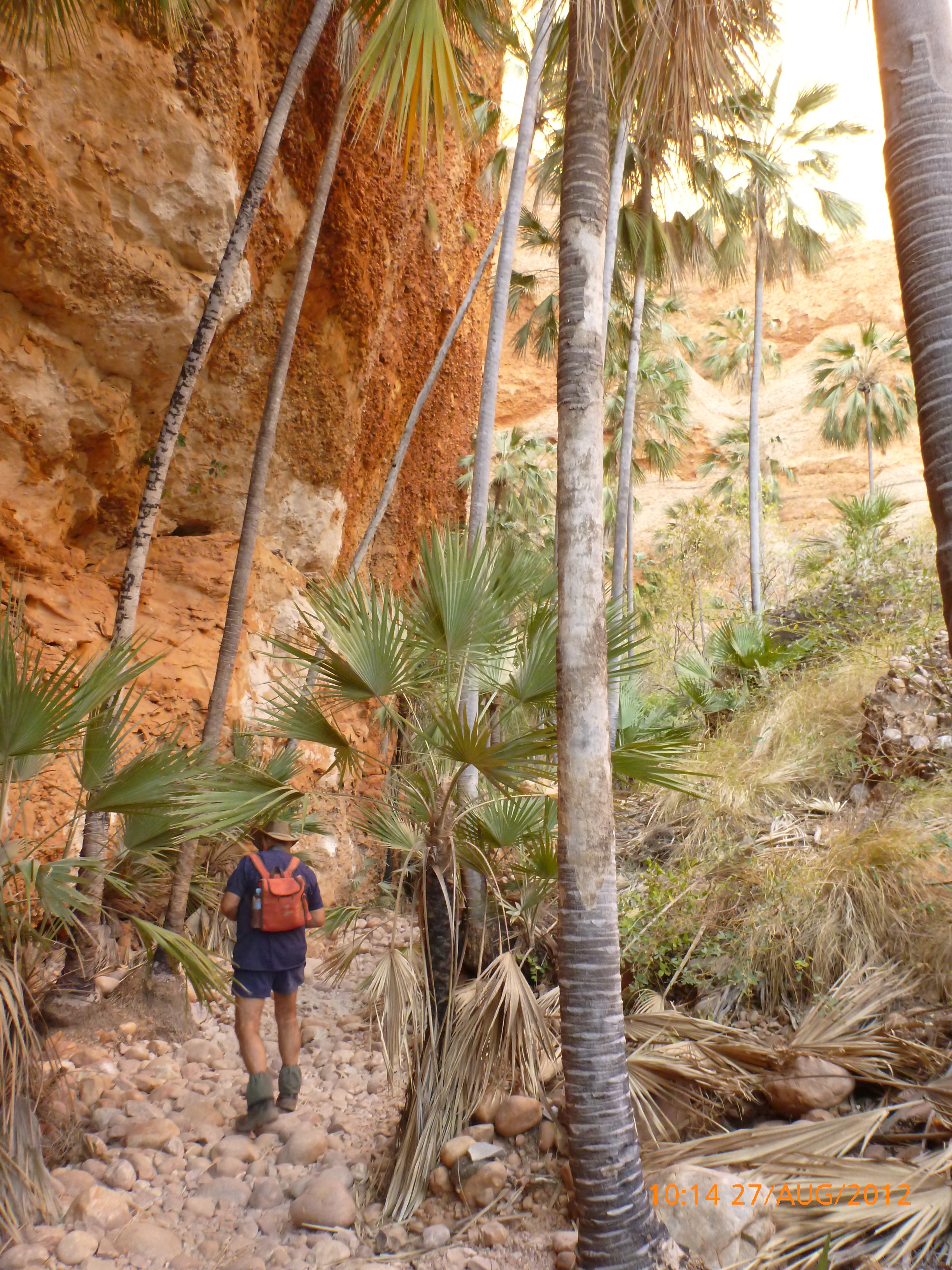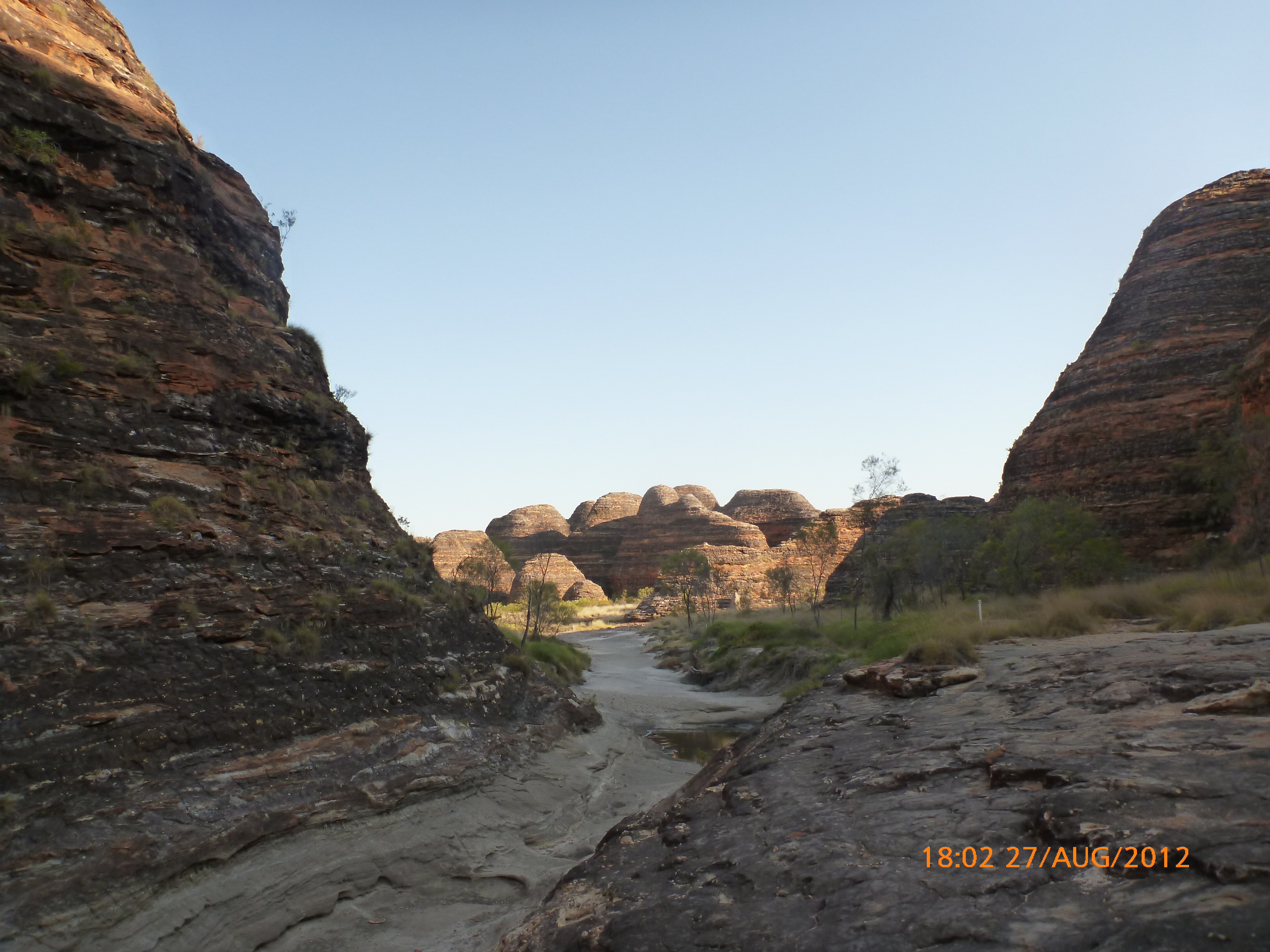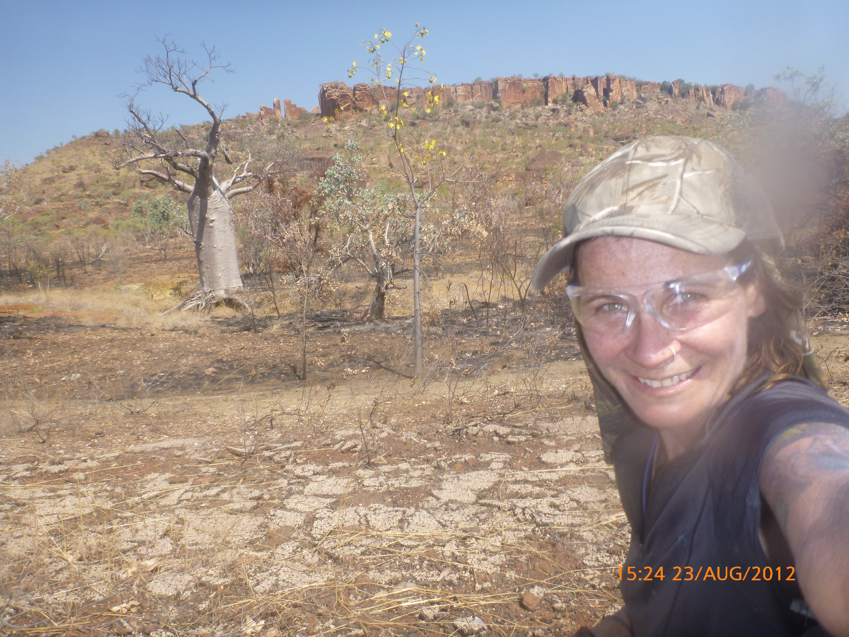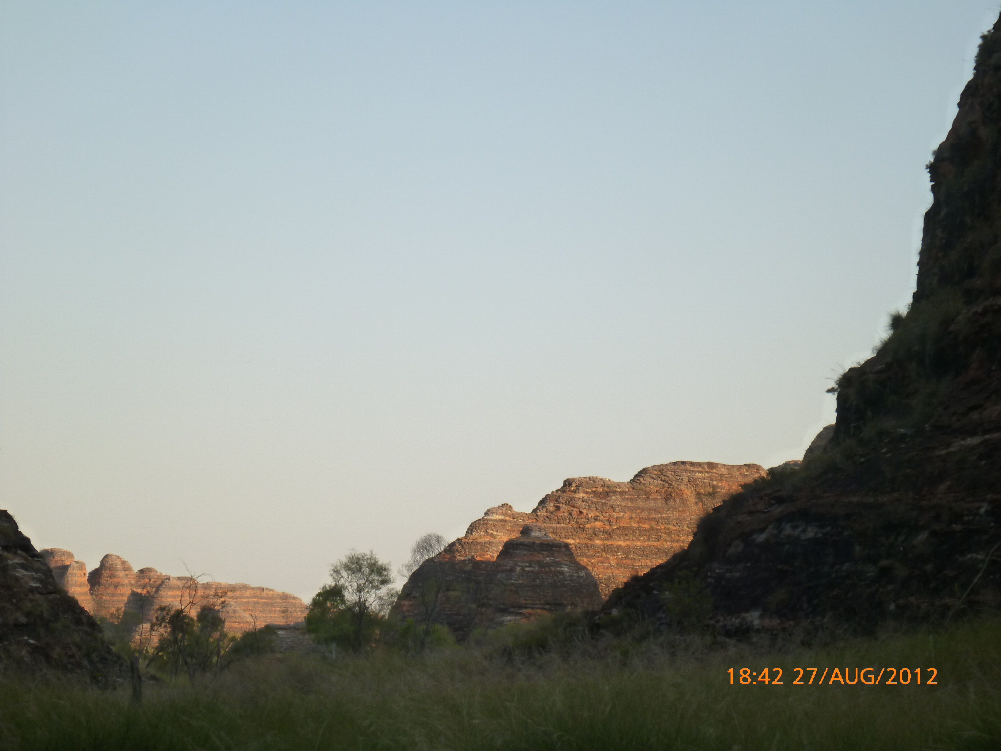 Day 54 88 days to go. Distances: Sun 26/8 Wamun (Turkey Creek) 96km, Mon 27/8 Purnululu NP, Bungle Bungle Range 0km, Tue 28/8 Mary Pool RA 116km, Wed 29/8 Fitzroy Crossing 187km, today 94km total 3990km. It’s 4pm Thursday 30/8/12 Ellandale RA. I’m currently sharing my peanut paste sammy with a whole bunch of top-knot pigeons that are clearly very wild and shy. I arrived about 2ish and only just now feel some personality coming back to my brain. This is in noway a winge as the weather is sensational but it’s between 38-42 degrees and I’m still sorting how best to balance the kms and heat stress. I pulled up today well and truly brain fried and the body stepped in saying ‘no more today Maree.’ But it was a late start after a late night and my liberated moment of turning the alarm off at 5am came back to bite me. I didn’t get on the road until 8am about 3 hours later than when I need to be. Today just reminded me of that so good revision lesson. I haven’t had heat stress since starting off in Thailand and it’s a bit icky tricky. What comes to mind is the first days of rain leaving Brisbane and thinking, ‘there be days down the track where you’ll want to be down poured on….yep these are those days I be thinking !!!! 🙂 So from tomorrow until we hit a change in weather it’ll be 4am up and 5am starts. It seems the more difficult the conditions the more kind folk become…isn’t that an awesome thing!! At the rest area was a hippy bloke I met at the RA out of Kununarra. He’s from the Blue Mts traveling for 3months with his border collie but heading home now cause he’s homesick and misses his Mum. He’s untidy around the edges but a big sweet kid and topped up all my water bottles before heading. Then George who’s from Caboolture and traveling with his wife and another couple, came over and said, ‘when you’re ready come over for a cool drink.’ I beat him back to his van and stayed for an hour enjoying the shady sit and warm company. They have a 17 y/o cockateal called Sparky who’s mummy’s boy and living the dream on the road with mum and dad. They can reach the ripe ol’ age of 30!! His only close encounter has been with a baby cassuarie in Mossman but mum snaveled him first so Sparky’s adventures continue. I then went to set up camp and the lads came over with a tarp to block the afternoon sun. Another german couple cam over with two oranges which I’ve just now devoured and shared with the bush bees. They are just as persistent and sticky as the desert flies so the head net is well and truly on. It cools down slowly now to balmy beautiful evenings and sleeping under the grasshopper fly is so beautiful. It’s full moon on the 1/9 so the stars and moon are currently serenading me nigh nighs. I haven’t managed a post for 5 days with all that’s been happening well into the evenings.