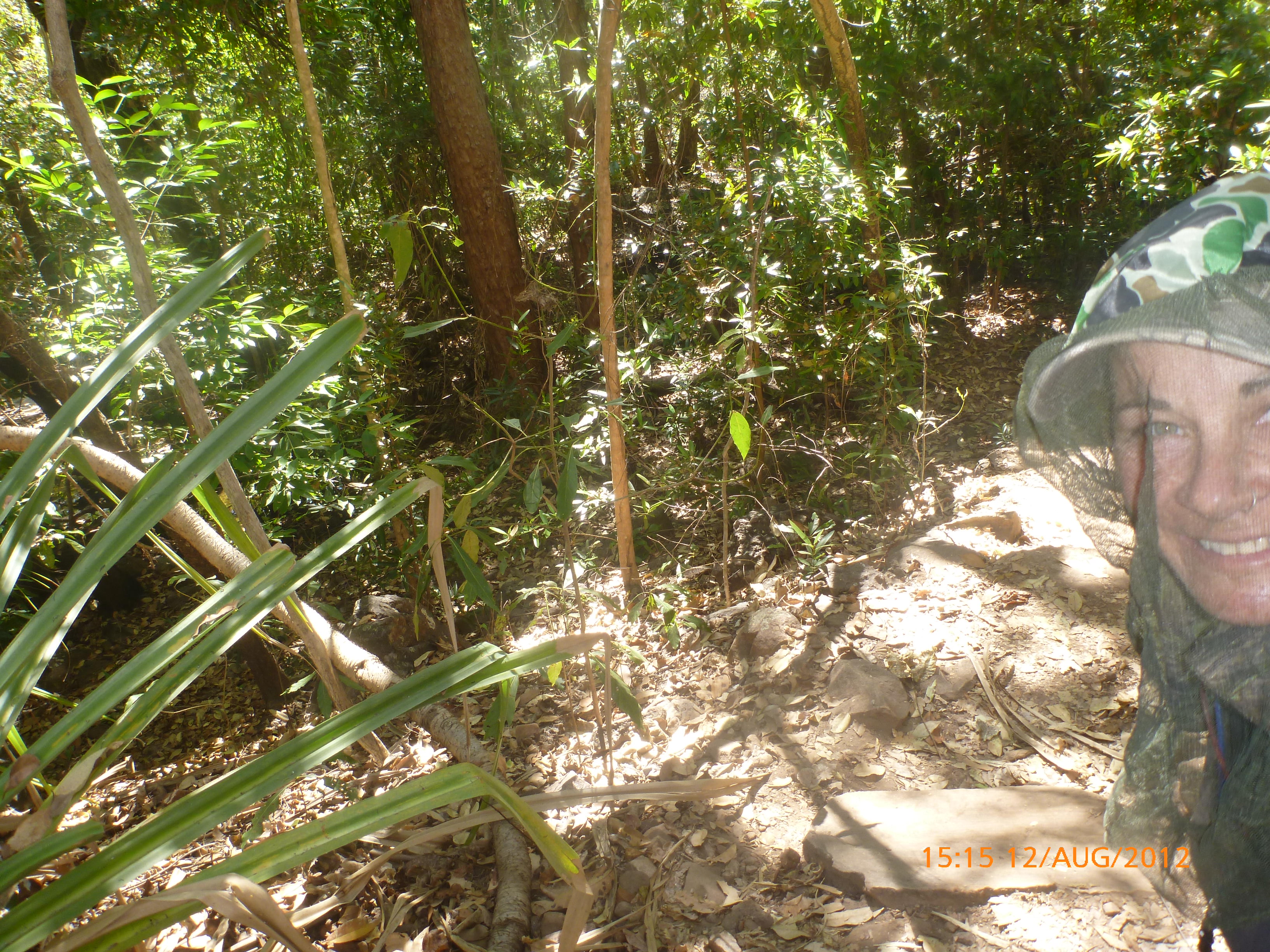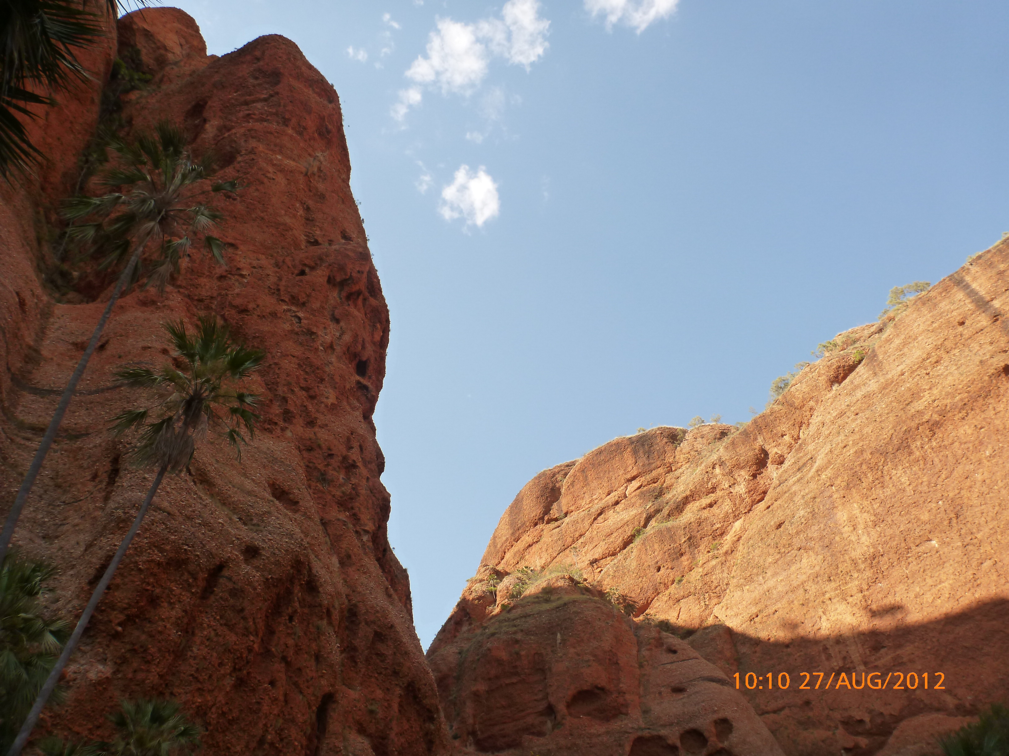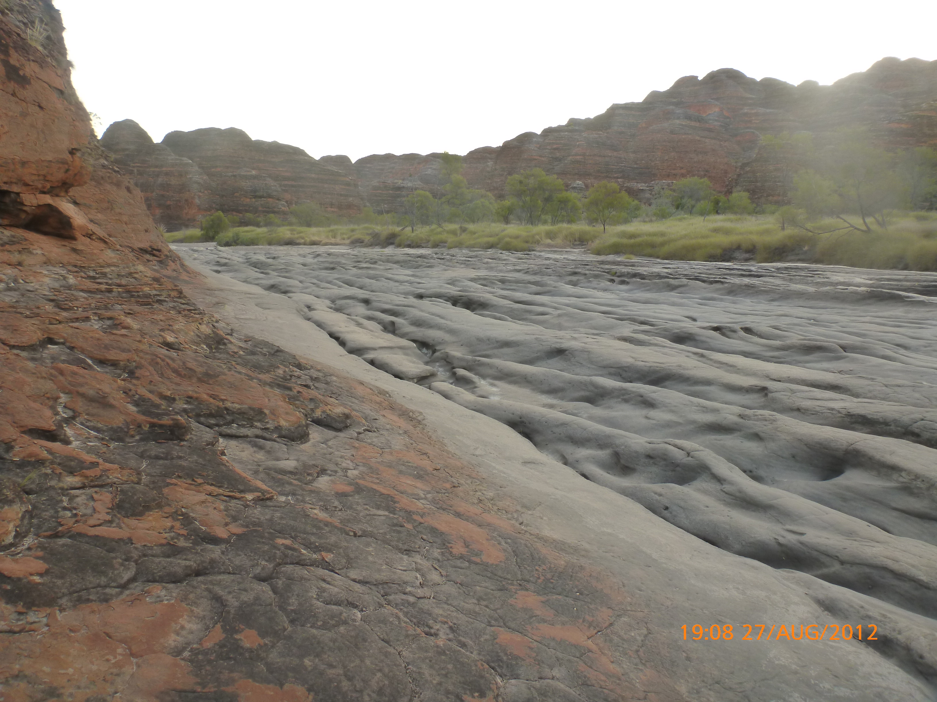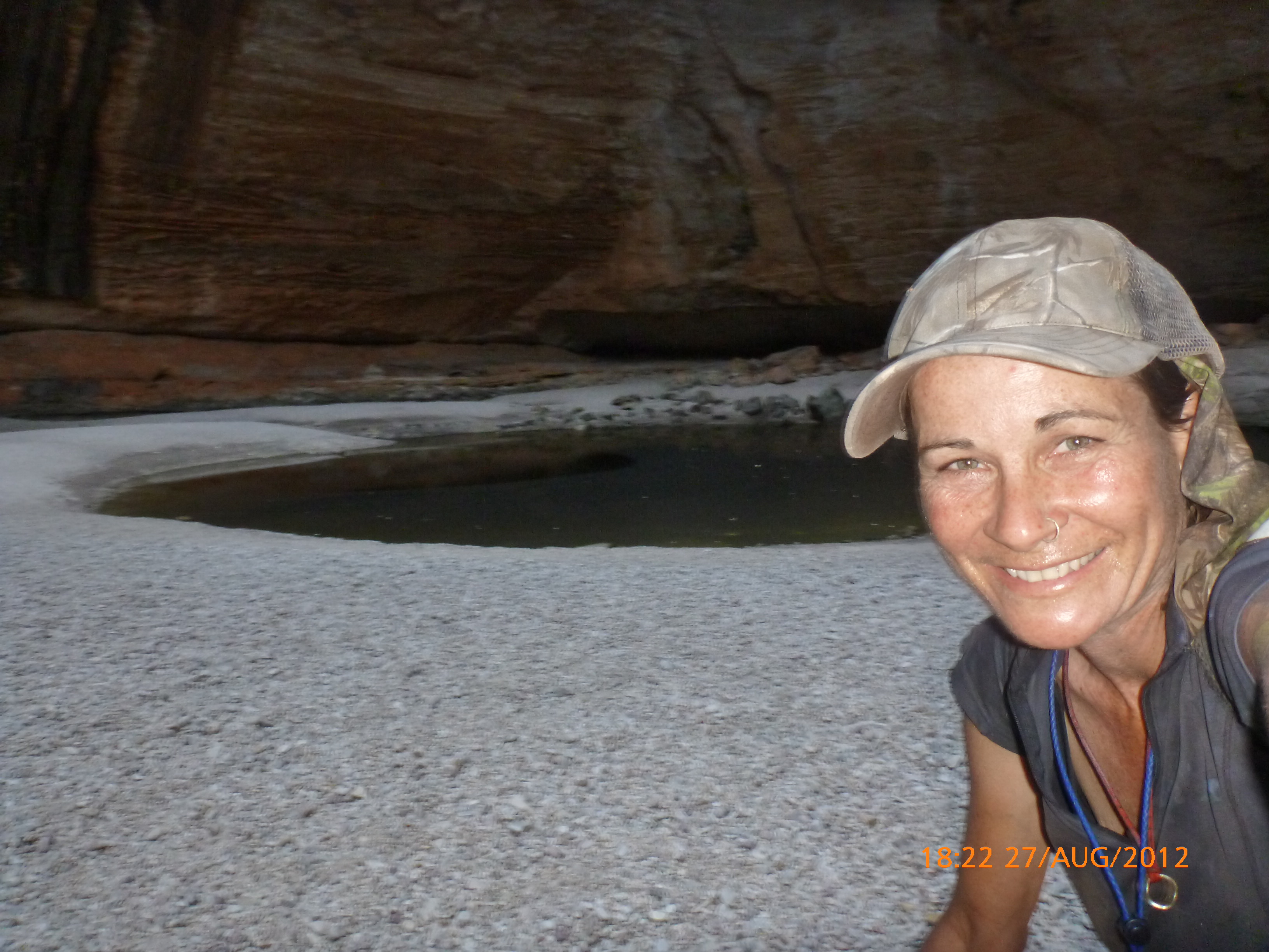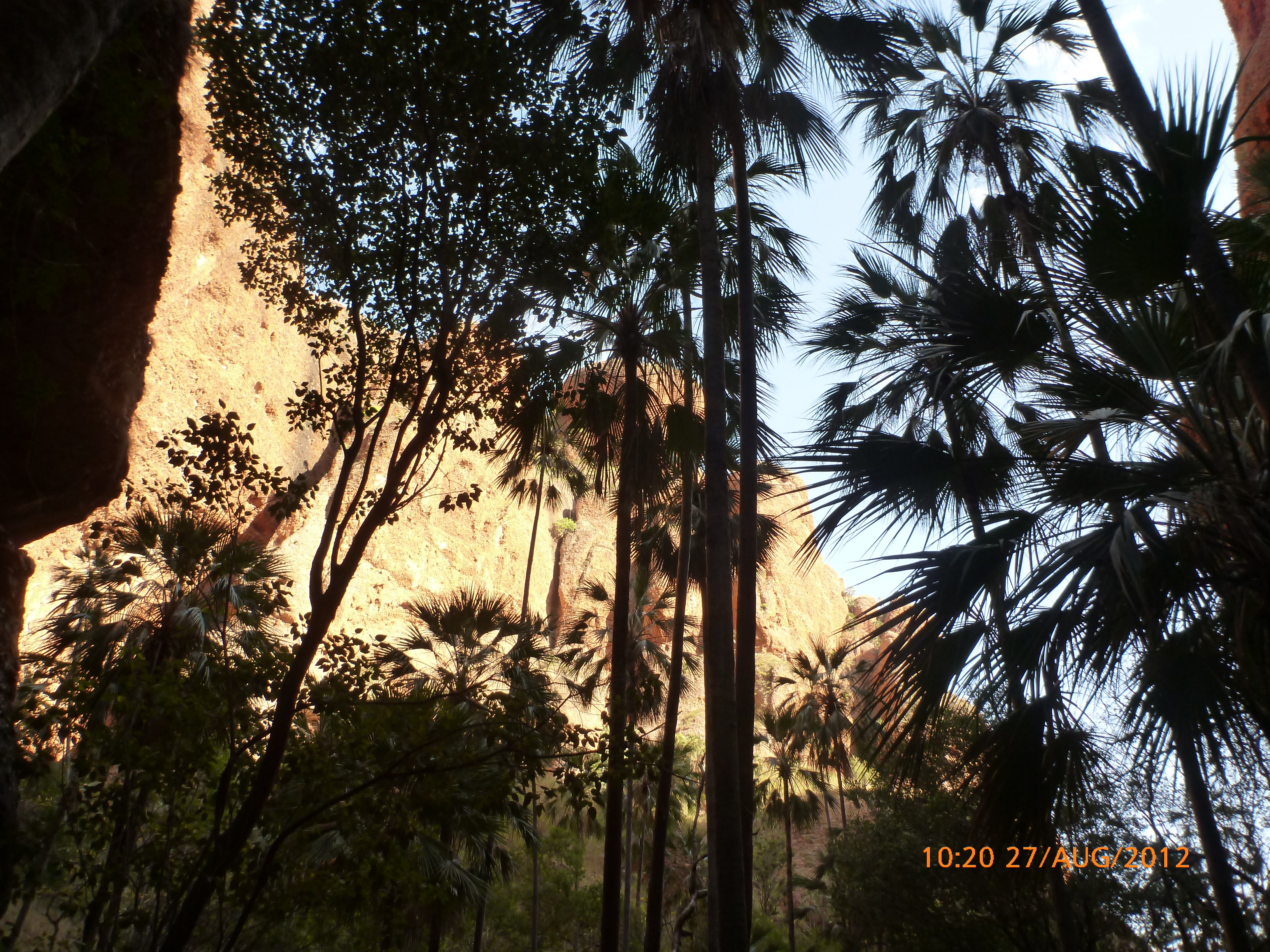 Day 54 88 days to go. Distances: Sun 26/8 Wamun (Turkey Creek) 96km, Mon 27/8 Purnululu NP, Bungle Bungle Range 0km, Tue 28/8 Mary Pool RA 116km, Wed 29/8 Fitzroy Crossing 187km, today 94km total 3990km. It’s 4pm Thursday 30/8/12 Ellandale RA. I’m currently sharing my peanut paste sammy with a whole bunch of top-knot pigeons that are clearly very wild and shy. I arrived about 2ish and only just now feel some personality coming back to my brain. This is in noway a winge as the weather is sensational but it’s between 38-42 degrees and I’m still sorting how best to balance the kms and heat stress. I pulled up today well and truly brain fried and the body stepped in saying ‘no more today Maree.’ But it was a late start after a late night and my liberated moment of turning the alarm off at 5am came back to bite me. I didn’t get on the road until 8am about 3 hours later than when I need to be. Today just reminded me of that so good revision lesson. I haven’t had heat stress since starting off in Thailand and it’s a bit icky tricky. What comes to mind is the first days of rain leaving Brisbane and thinking, ‘there be days down the track where you’ll want to be down poured on….yep these are those days I be thinking !!!! 🙂 So from tomorrow until we hit a change in weather it’ll be 4am up and 5am starts. It seems the more difficult the conditions the more kind folk become…isn’t that an awesome thing!! At the rest area was a hippy bloke I met at the RA out of Kununarra. He’s from the Blue Mts traveling for 3months with his border collie but heading home now cause he’s homesick and misses his Mum. He’s untidy around the edges but a big sweet kid and topped up all my water bottles before heading. Then George who’s from Caboolture and traveling with his wife and another couple, came over and said, ‘when you’re ready come over for a cool drink.’ I beat him back to his van and stayed for an hour enjoying the shady sit and warm company. They have a 17 y/o cockateal called Sparky who’s mummy’s boy and living the dream on the road with mum and dad. They can reach the ripe ol’ age of 30!! His only close encounter has been with a baby cassuarie in Mossman but mum snaveled him first so Sparky’s adventures continue. I then went to set up camp and the lads came over with a tarp to block the afternoon sun. Another german couple cam over with two oranges which I’ve just now devoured and shared with the bush bees. They are just as persistent and sticky as the desert flies so the head net is well and truly on. It cools down slowly now to balmy beautiful evenings and sleeping under the grasshopper fly is so beautiful. It’s full moon on the 1/9 so the stars and moon are currently serenading me nigh nighs. I haven’t managed a post for 5 days with all that’s been happening well into the evenings.