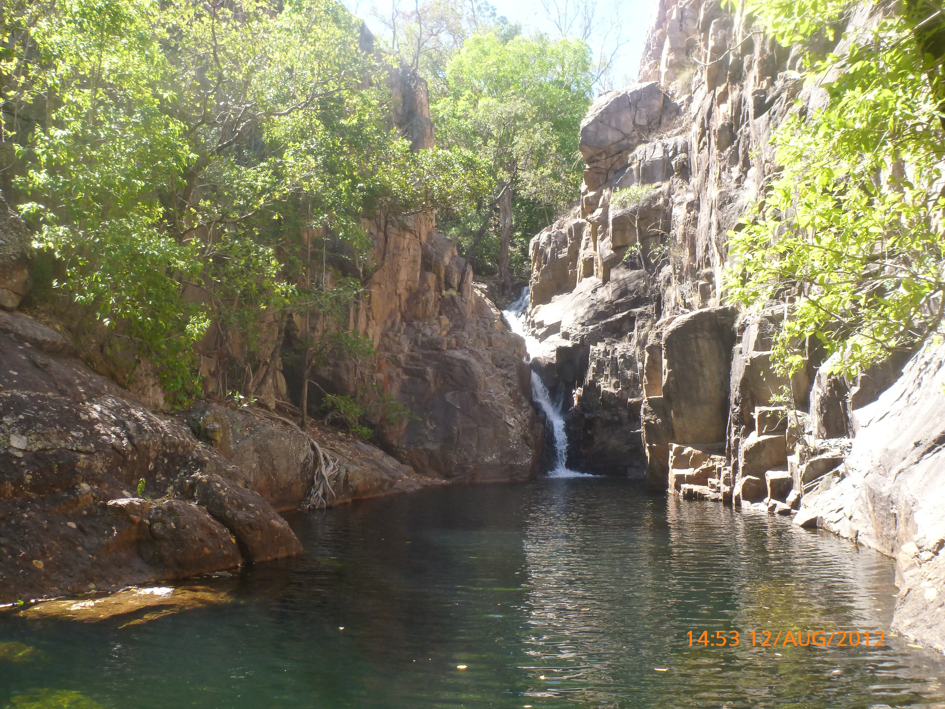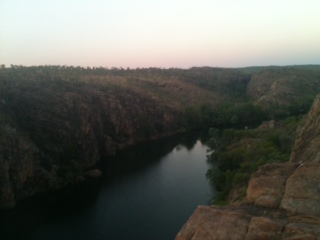 I got up super early Saturday morning and went for a 2hr huge run to see the sun come up and check out the Darwin Peninsula from the wharf round to Mindy beach famous for the sunset markets Thursday and Sunday nights. Back home for some breaky then we hit the Saturday markets opposite Fannie Bay. They are a multi cultural market with international foods and smells that kept me floating for the hours of wondering. Fabulous place and a haven for those of us who love to butter fly from one cool sensation to the next. We did some great shopping and my best eatty treatty was a Chinese container jam packed with sliced frozen mango for $3 oooooohhh myyyyyyyy loooordy yuuuuum!!! I sat indulging just short of an ulcer all the while listening to a young Bolivian lad busking with his ukulele and bamboo mouth organ…… he was pure fun talent ta boot. Sunday we drove back down the Stuart Highway via Litchfield NP, Edith Falls and Katherine Gorge. I had the best swims in what was the clearest blue green waters alive with fish but no big lizards. We chose Wangi falls at Litchfield and it was a delish choice and a playground of paradise. There are so many walks and options in all three areas to visit and I’m so glad we got a great taste bud fix ’til next time. Edith falls were allot shorter but the waterhole a bigger expanse diametered with sheer rocky cliffs. And the crème de la creme to end the day was to see the sun set from on-top Katherine Gorge. It was a pretty hot spot day road trip that would take some beating as far as cool factor goes. I’m on such a high of delights care of Mother nature and Country NT style.