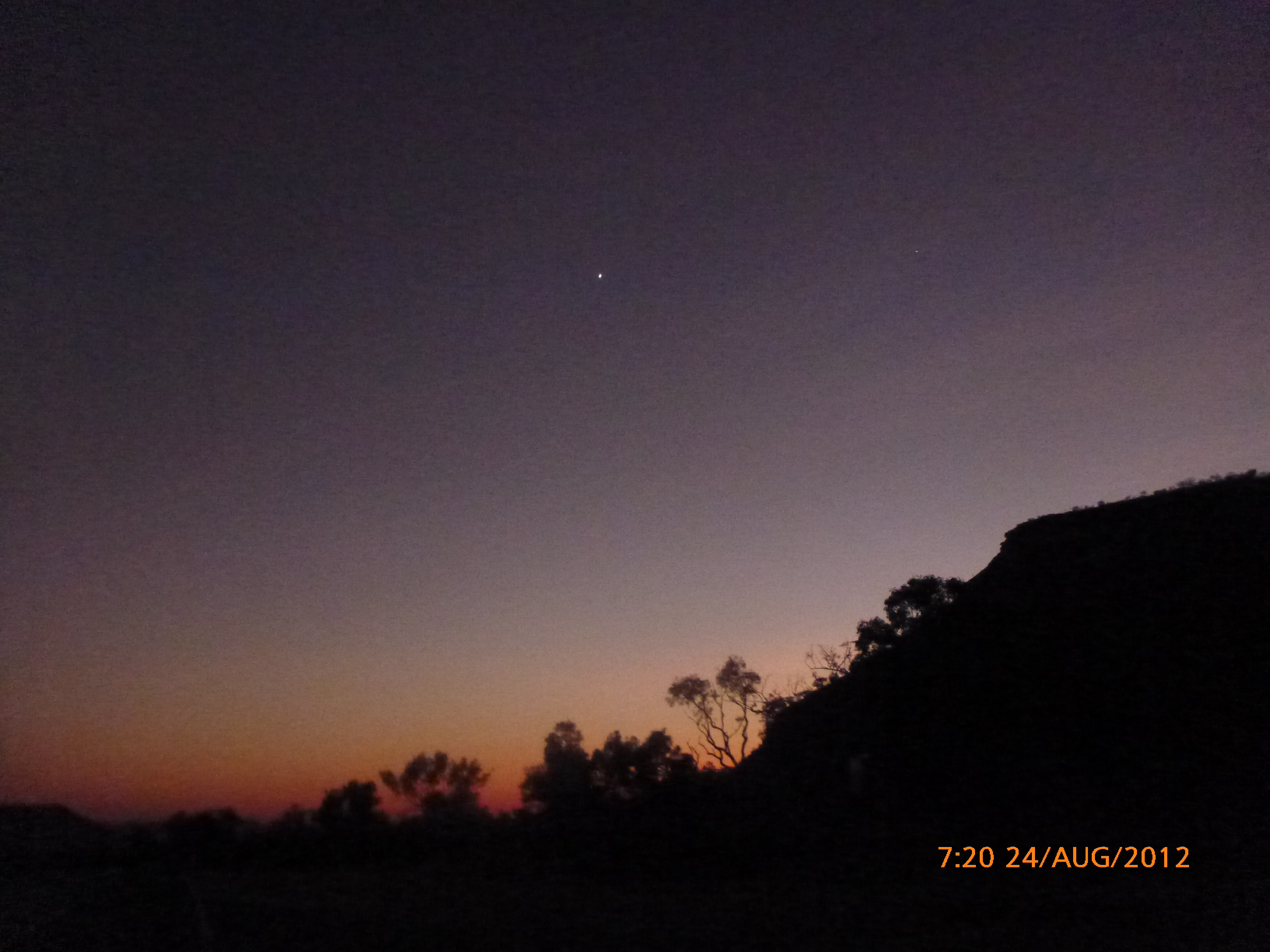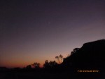Day 48 94 days to go. Distance: yesterday 126km today 165km total 3432km. It’s 8.20pm Friday 24/8/12 Cockburn Rest Area. Hi there fine folk and welcome to the Kimberley’s. The Victoria River Region was the warmer upperer. Since then we’ve entered a land of rolling hills, boabs and red rock escarpments and formations. It’s rugged and wild and beautiful. The rock is all water marked where during the wet season waterfalls run freely and gather in the floodplains along the Savannah. We passed that way yesterday and for the first time moved through an area devoid of life now during the dry, apart of grasslands and sparse trees. It was so apparent the missing birdlife through the floodplains. Rube and I spotted one tweet tweet bird but he was clearly lost and out of there before we could say ‘hello mate.’ This part of the ride was hot and slow creepy inclines with heavy duty bitumen that had little roll. Therefor the first 100km was well well earnt and we did it tough. So much so it was time for Ipod tunes. I was absolutely rescued by music specifically the countdown wonder years. Thankyou Janny love this CD you gave me years ago gave us such a natural high we literally danced and sung our way for the remaining 26kms. Big fun!!!The power of Aussie countdown hey? It was about this time that the enscarpment we’d been looking at a distance all morning came into its own and we found ourselves in the Kimberleys so so magical. A family stopped ahead of us on the roadside who we had met in Mataranka. They wanted to say hi and offered us their fruit and honey leftovers as they were traveling onwards to the WA border. There’s strict quarantine regulations coming into WA so we happily accepted the assortment of treats and got some pickies yay. The Saddle Creek Rest Area we stayed last night was the nicest yet. It was tucked at the base of sheer red rock walls all water washed and glowing orange, pink and red as the sun slowly set showing off it’s magnificence in that landscape. I met really cool people last night so much so it was late o’clock by the time I finished chatting and I just fed the starvs and passed out for an early start this morn. Firstly I got to talking with Sue and Paul who gave me a coke when I first stopped. yum!!!! no really yummy!!! They also donated $20 thankyou and shared some of their fruits. They have invited me to stay with them in Geraldton WA which is very cool and so appreciated. There were two other cyclists staying at the rest area ‘Sal’ and her male friend. They are alternative lifestyle folk on a spiritual journey that has lasted already 2 years and not ending any time soon. They work as needed picking fruit with the seasons and were so endearing characters. As an example Sal thought the toilets at the BP Kununurra needed cleaning so did so just to help out. She accepted a free shower as payment but pretty much is about karma an unconditionally helping where she can as she travels. What a beautiful soul. We sat under the shelter talking for hours along with Julie and her husband who made us all coffee and shared in the quality chats. Julie nowadays lives in SA but spent a significant proportion of her childhood in Darwin and grew up with the local indigenous families sharing their cultural experiences like fishing and walkabouts and eating off the land. I listened to her stories in awe and her appreciation for culture and country is still so apparent. Sal also grew up across this area and the two bounced off stories and reminisced of a lifestyle in the 70s and 80s so fascinating it was a pleasure to listen and be part off. Sal and her friend headed off when the sun went down as they cycle in the cooler morning and evenings so we grabbed so pickies before they left and exchanged details. They have $50 old Melvin star bikes but their add hoc approach works beautifully for them. I wish them a continued safe journey and thank you so much for our time shared. I also exchanged details with Julie and I hope we keep contact she’s a very special and very very interesting and fun woman. Happy travels guys and I may see you when I come through SA. This fella came over as we were saying our goodbyes and said he and his partner had passed me now about four times. They invited me to sit and we chatted a while and exchanged travels stories. I can’t remember their names bugga but hopefully will get an email from them. They shared their stir fry veggies and mashed potato left overs which were just yum thank you!!! There’s been a group of 3 stars I have noticed in the sky that I haven’t seen before and they make a perfect triangle and are a clear feature. I had thought it unusual that I didn’t know them as I’m a star gazer back home. He was explaining that they are mars, saturn and a star that are unusually aligned and slowly the triangle will start to change shape as the planets move.