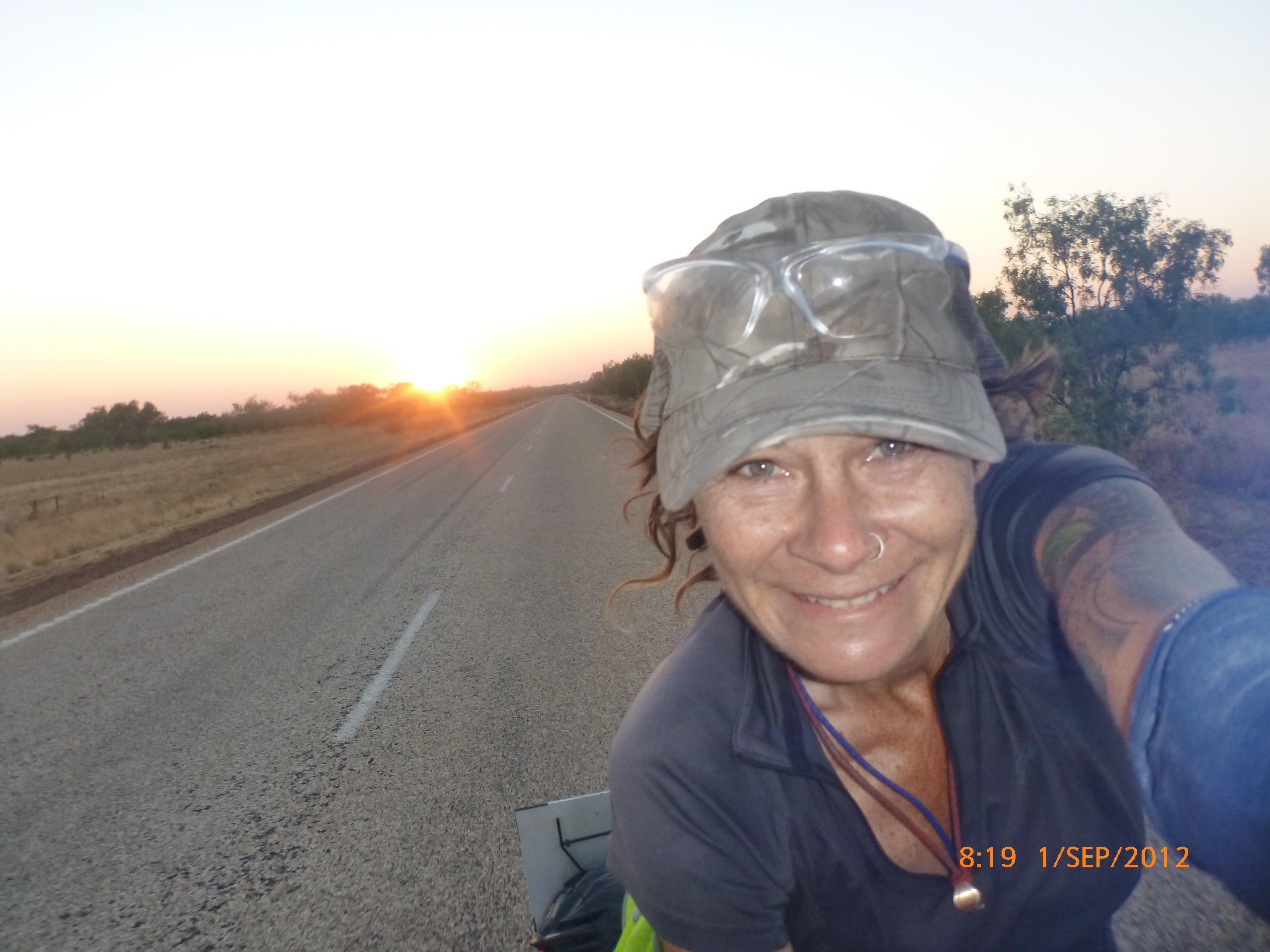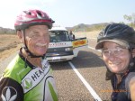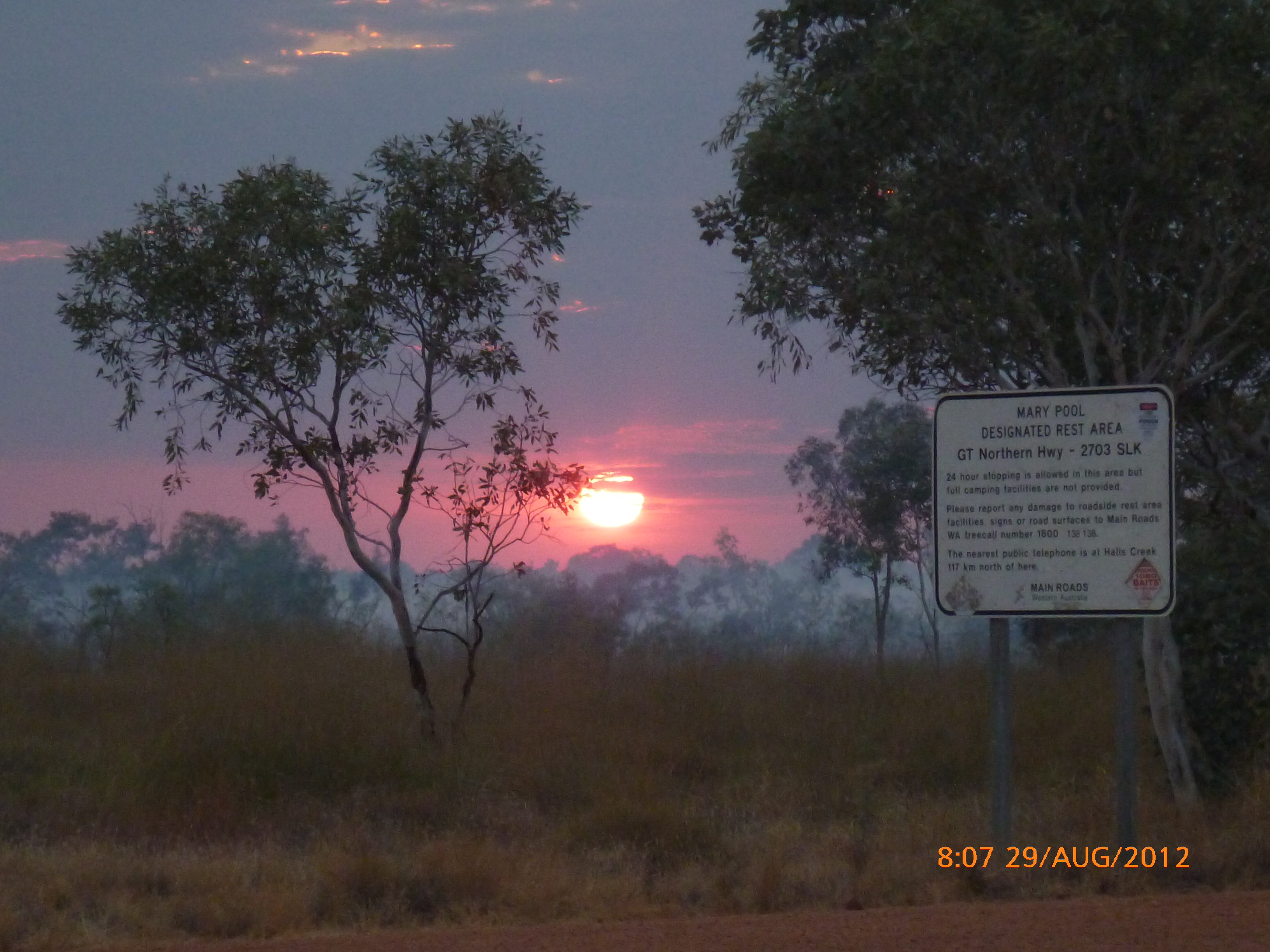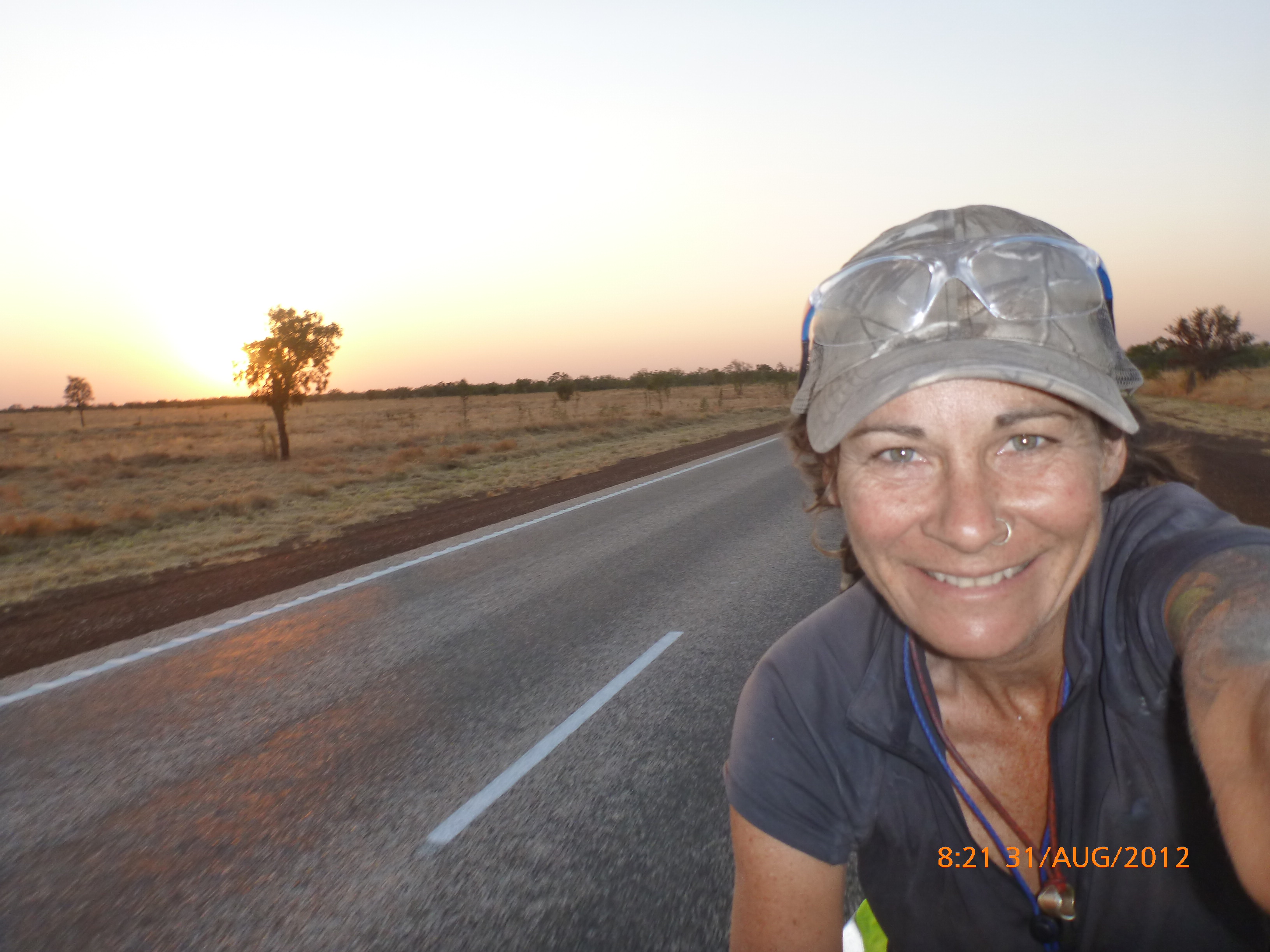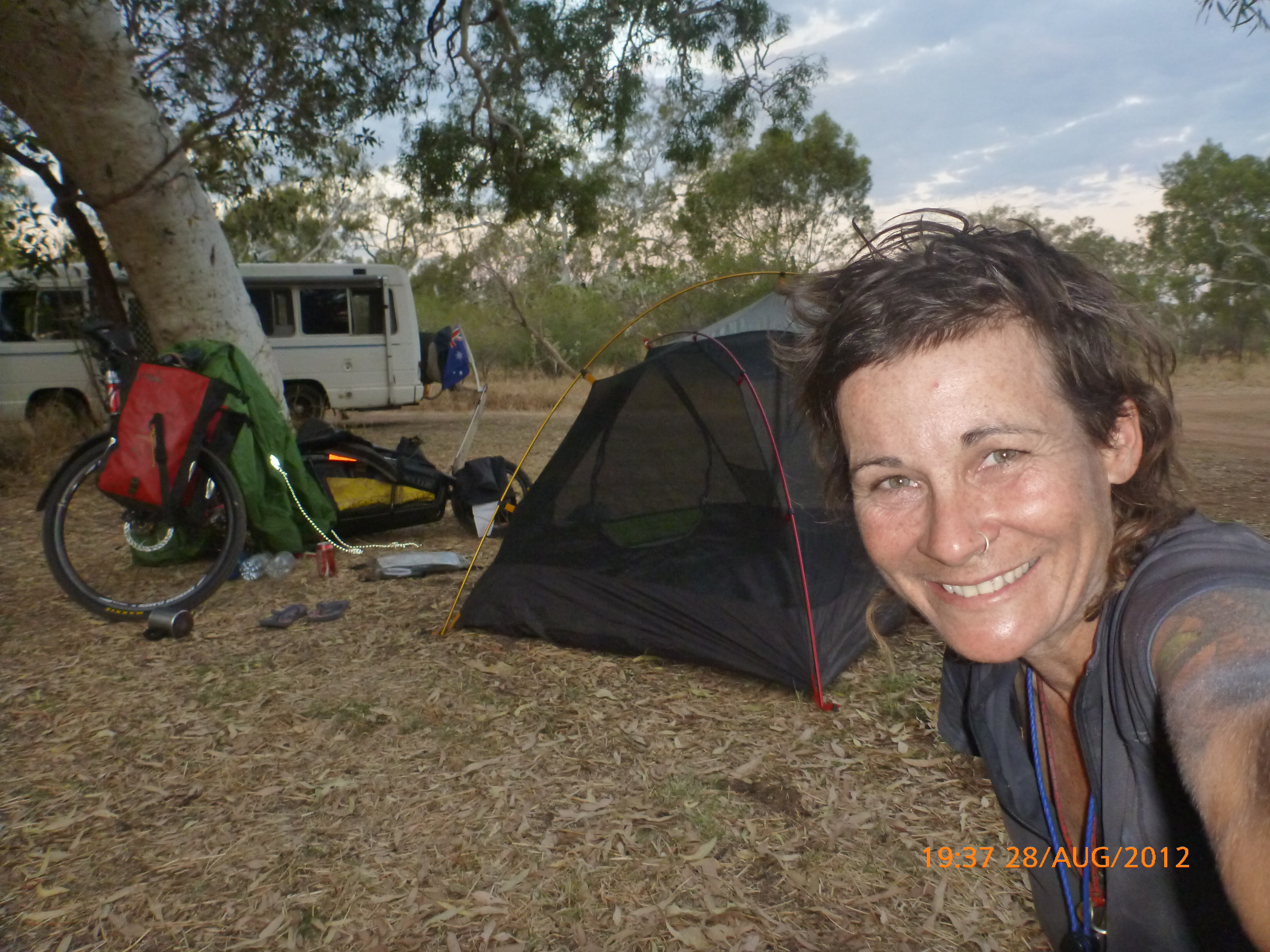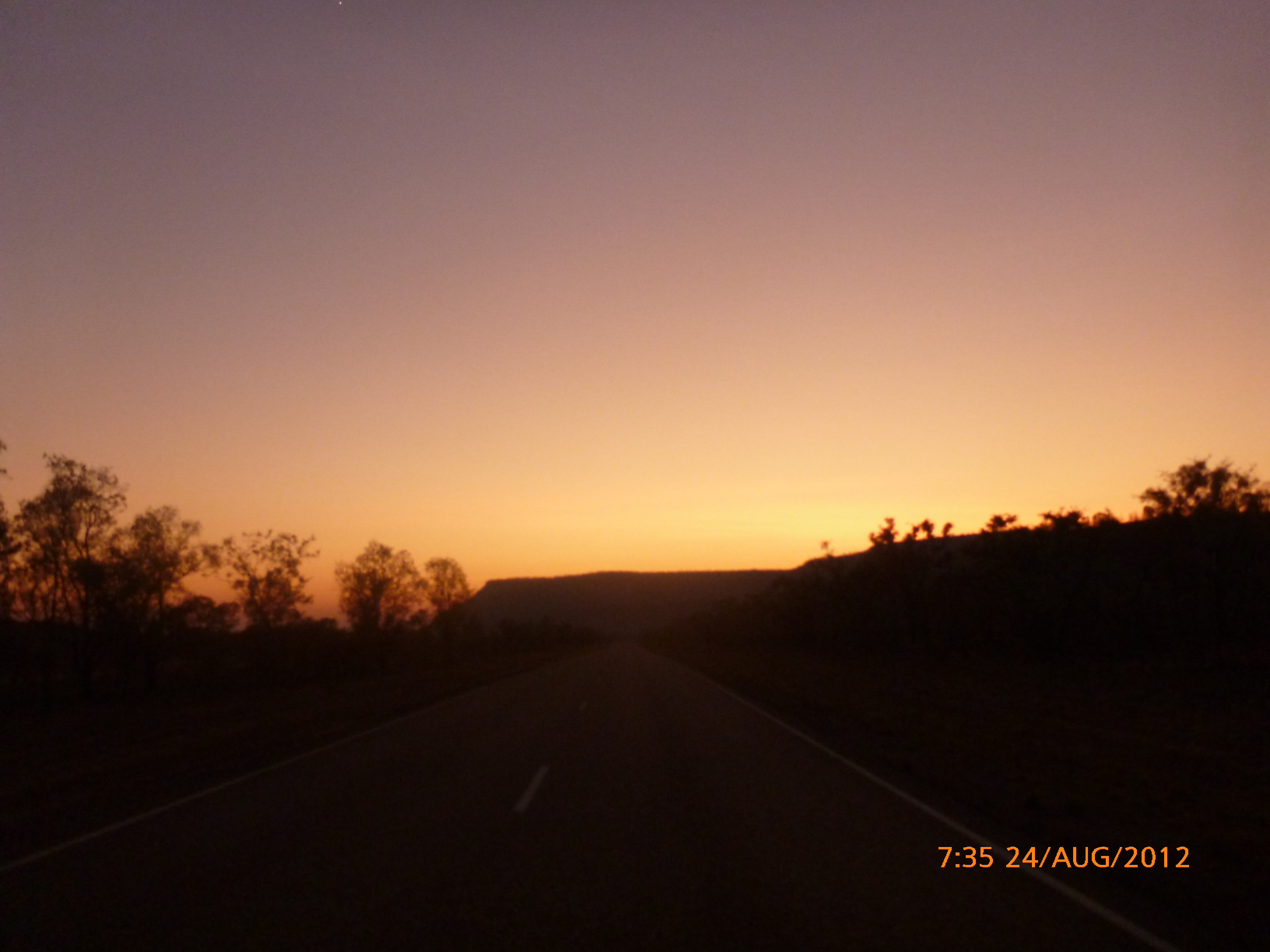 Day 46 96 days to go. Distance: today 105km total 3242km. It’s 7pm Tuesday 21/8/12 Mathison Rest Area. It’s on dusk now and a beautiful twilight to do my post by tonight. Ive spent the last hour or so pawing over the Camps Australia bible trying to figure out how to see the ‘stairway to heaven’ in Broome on the 31/8. I showed Rube and her comment was ‘so a few early starts hey – I’m up for it if you are’ Thats my girl!!!! I’ve tried to put a few shorter days in to mix it up somewhat but on paper at least it’s 1577km in 10 days averaging 158km per day nice nice pheweeeee…..nice nice!!!!! God I love challenges. They really make me tick. And the ones I set I have no idea whether I’ll be able to manage it or not but that’s what makes it a challenge with an edgy cool factor yay. Rube’s right up there alongside me in that regard so the perfect match yay yay. I wanted to include a cycle in/out of the Bungle Bungles but unfortunately its a 55km ‘rough dirt road in and we’re not set up for that. Can’t break my girl as there’s still a long way to Perth PS Sorry Moppy had hoped to share that one with you but maybe next time around with an off road set up