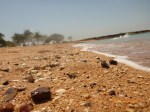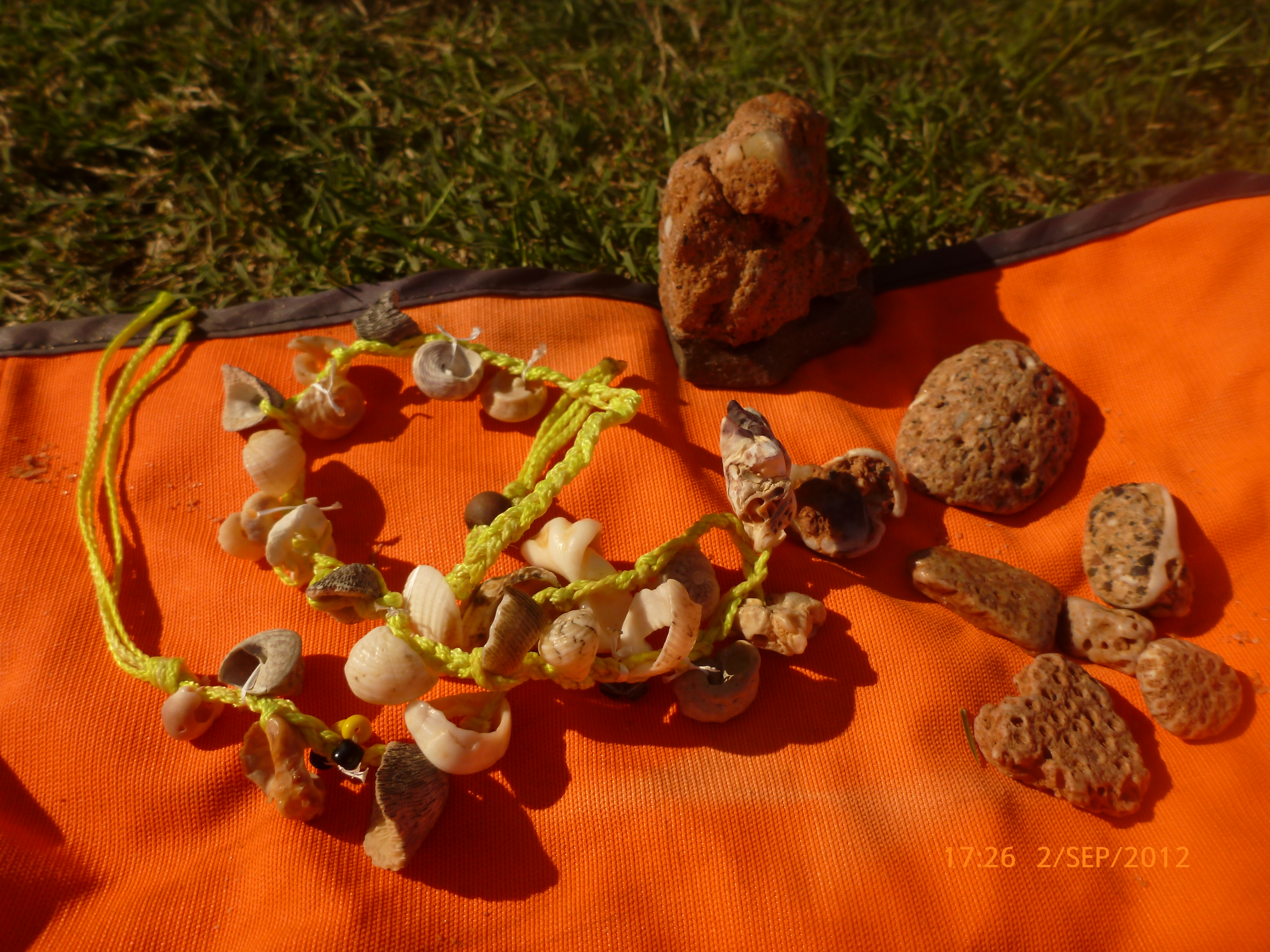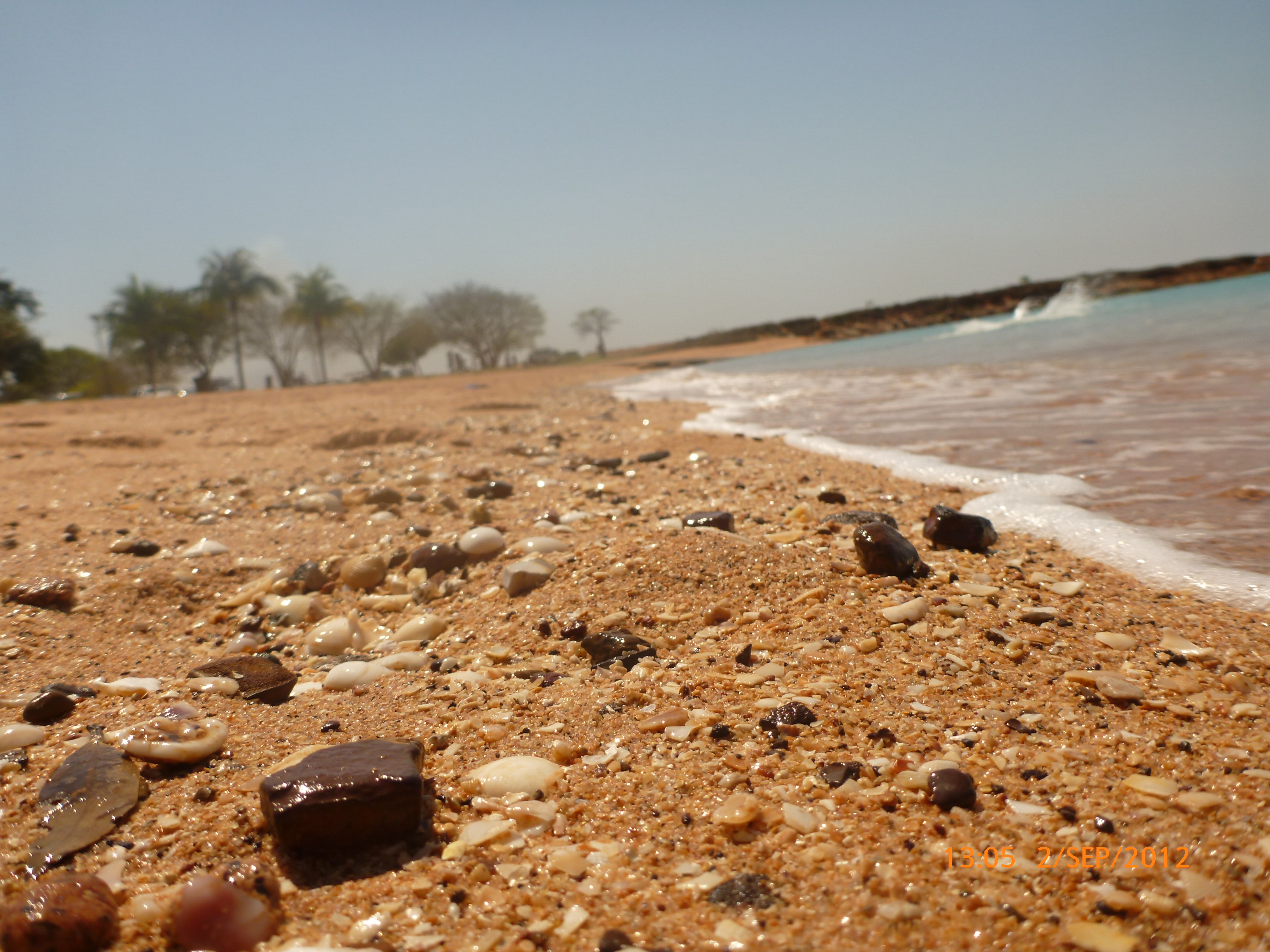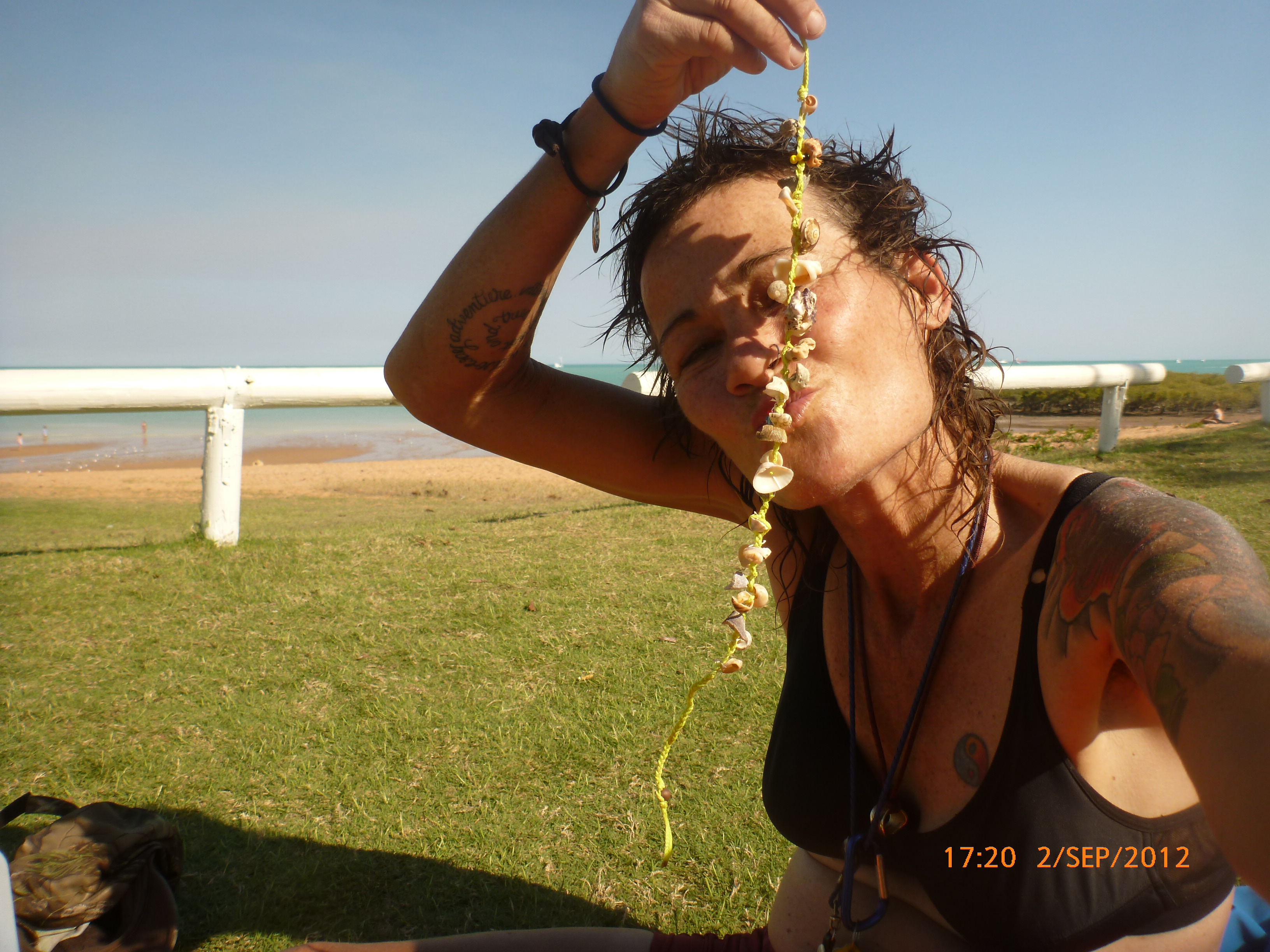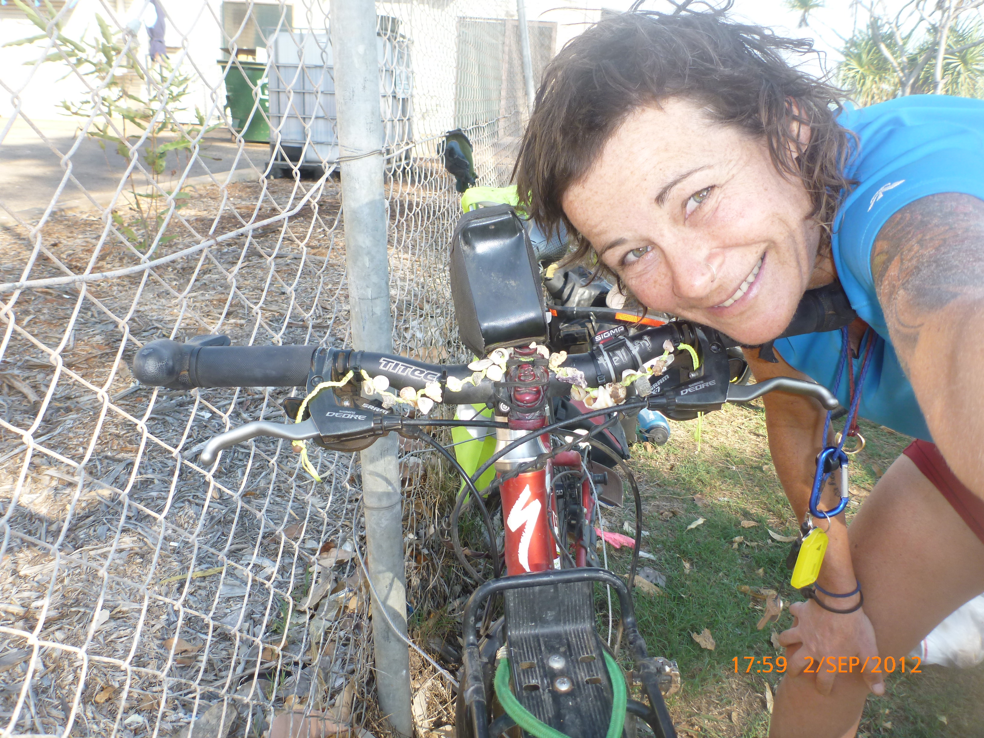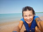 Day 57 85 days to go. Distance today 0km total 4314km. It’ 12.40pm Sunday 2/9/12 Broome. I’ve got an awesome assortment of shells I found earlier and am about to make a bracelet or necklace nice nice. A few days back rube spotted a ball of grasshopper green twin by the roadside that we bower birded and now I know why. It’s fun collecting stuff on our travels adding it to our treasures. Yesterday I found a ‘hot surface ‘ road sign warning that had blown off a truck and it’s now strapped on the back of my girl. I think it’s about it’s been but Rube reckons its about her LOL. She is after all a hot and spicy thing!!! I’ve met some local indigenous folk one fella walking his dog who has grown up in the area and was telling me about crocs and stingers. Ive been enjoying another family having big fun and playful dip next to where Im dugonging it. The brain is off from our norm but so ‘on’ taking in the little things big around the bayside. The water is aqua and clear and stunning. There’s a pod of dolphins playing just out from where you can wallow it in the shallows. The bay has a strip of sand with a fabulous array of shells and rocks. The rocks are fascinating mostly conglomerate fusions of shells, stones and sand. Just up from the beach strip is grassed and palm lined with shady spots tempting an afternoon kip. That may be on the cards but for now I’m under a patch of fronds ready for some jewelry making. Let’s see how we go. Rubes down at the boat ramp checking out the local fishermen’s catch of day. A